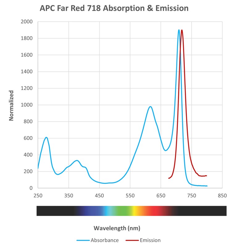 FR-APC antibody label is a far red-emitting tandem fluorophore that has an excitation peak at 713nm and an emission peak at 718nm. oYo-Link® SureLight® FR-APC provides researchers with a simple, fast, site-specific approach to labeling their antibodies with a brighter, highly photostable dye that serves as an excellent alternative to Alexa Fluor 700.